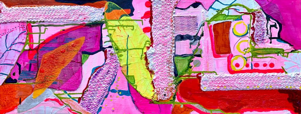 I have a mind whirring with ideas. Sometimes they are gently fluttering in large lazy loops. Usually they are tumbling over each other pushing and shoving, yelling “look at me, NOOOO look at me!” Queuing up in a jumbled line. Then, I pick one! Stepping out of my comfort zone in to the wild and wooly world of creativity. I take the leap and not three minutes into the “zone” my left brain says, “this is messy, you’re wasting a lot of paint, be careful you don’t want to spill on the floor”. The doubt and hesitation start. Dragging my big, bold idea down to trite and amateurish.