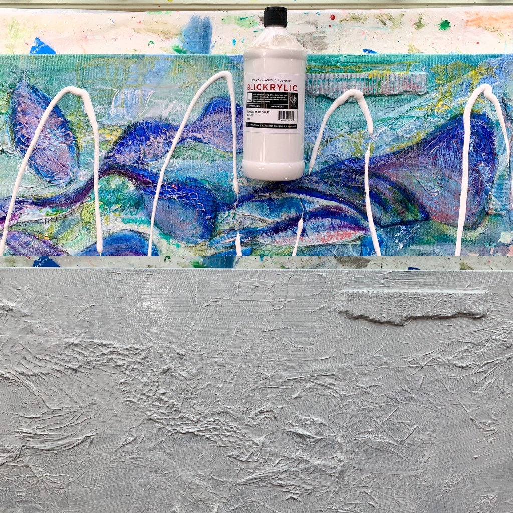 One of my favorite products is Dick Blick Blockout White Blickrylic Student Acrylics. It’s given me the freedom to experiment over and over again on the same canvas. Especially if I like the textures but not the colors/composition. I think of Blockout White as a giant eraser. I always have a bottle of this reasonably priced paint in my studio. Since the natural state of acrylic paint is glossy, applying a coat of gesso over the Blockout White gets some tooth back.