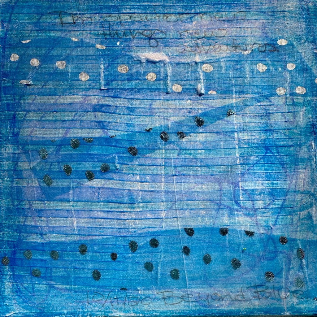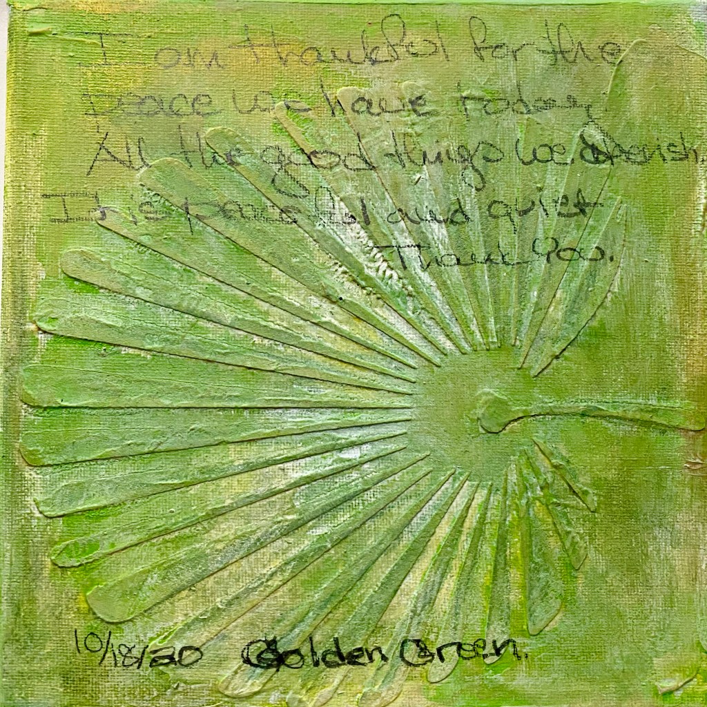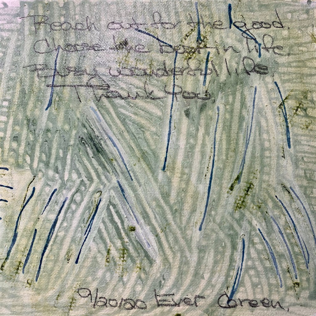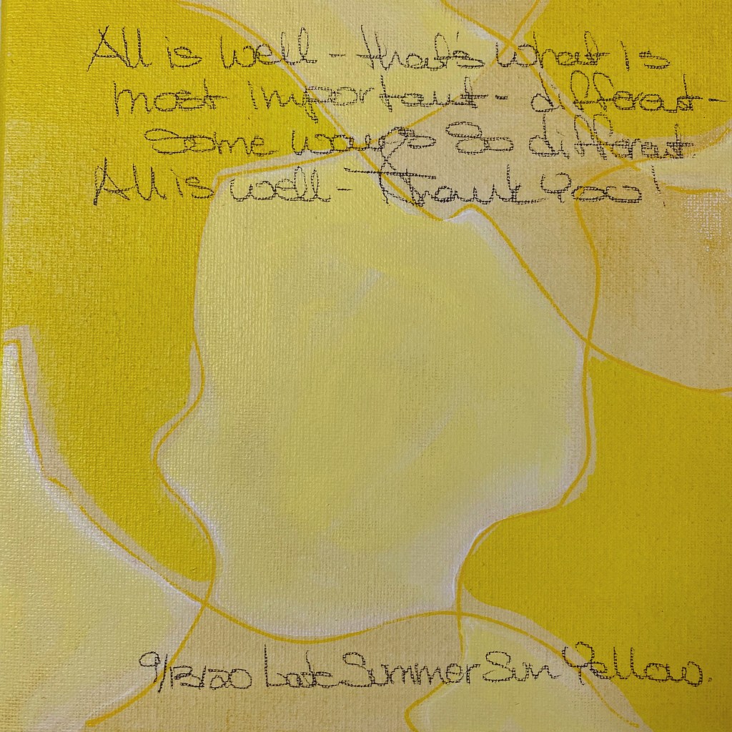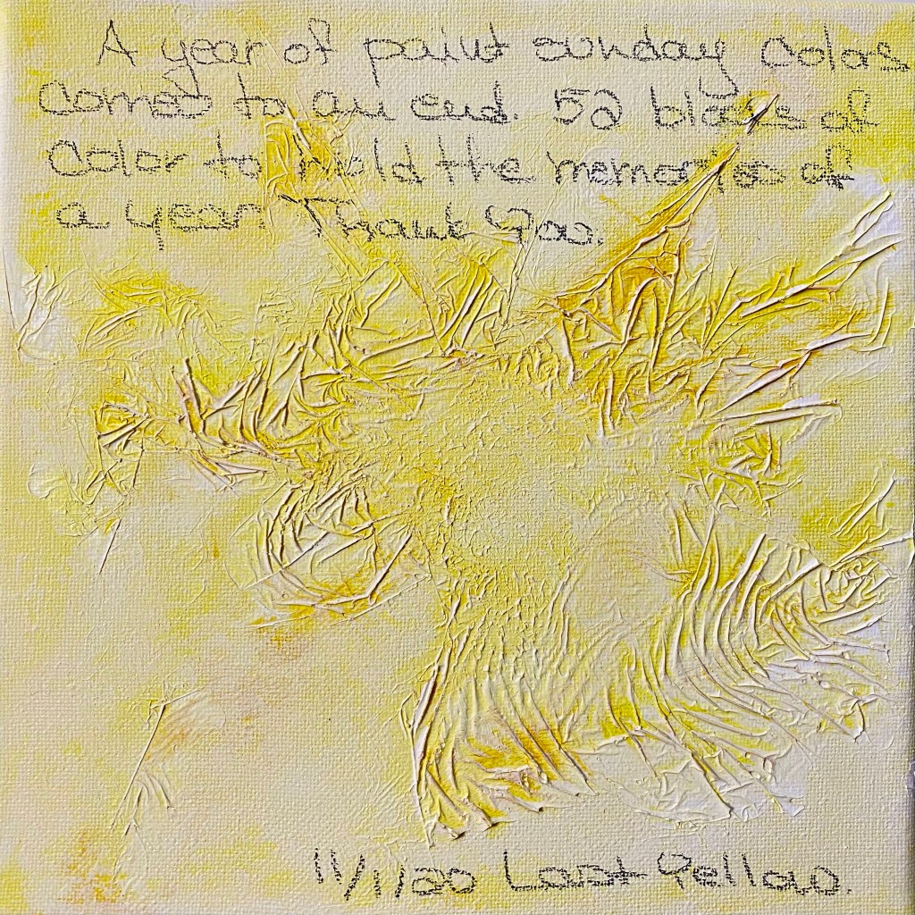 I’m very proud of myself for completing a years long weekly art practice. There were weeks I would dread starting a new color or worry about what I wrote. All the thoughts written on the canvases are “stream of consciousness”. Whatever came through my mind early every Sunday morning. Some of the colors I LOVE some I wanted to throw in the trash can and start over. I did not do this. Whatever happened stayed. I am thankful for this experience.