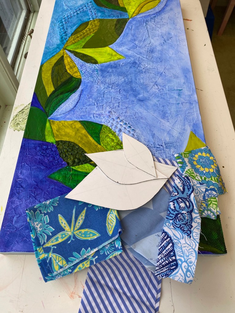 I have seen this done and really like the idea. I think in the past I have used the fabric to early in the process and its’s been covered up. I’m stalled with this piece. I don’t want to paint anything more and “wreck it”, but I think it’s boring. I have a couple of pieces where fabric might give a visual texture and I can try before I permanently attach. I’ll keep you posted.